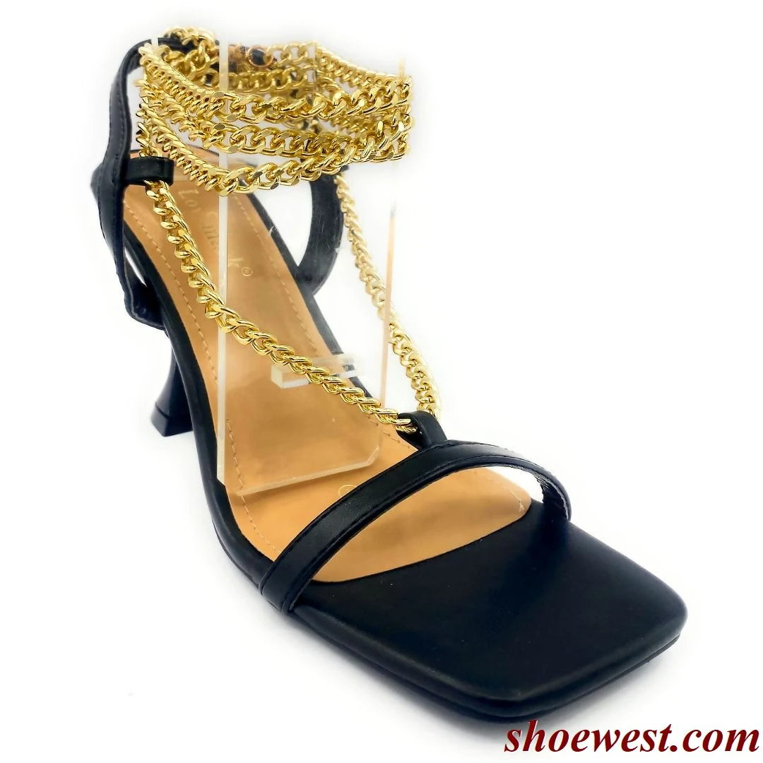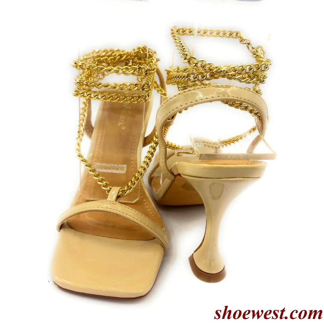 - This Heeled Sandal Featuring Wrap Tie-up Chain with Toe post Detail.