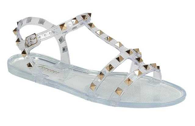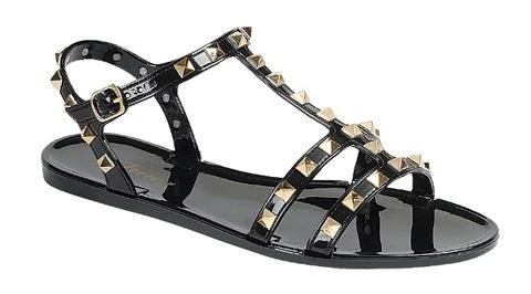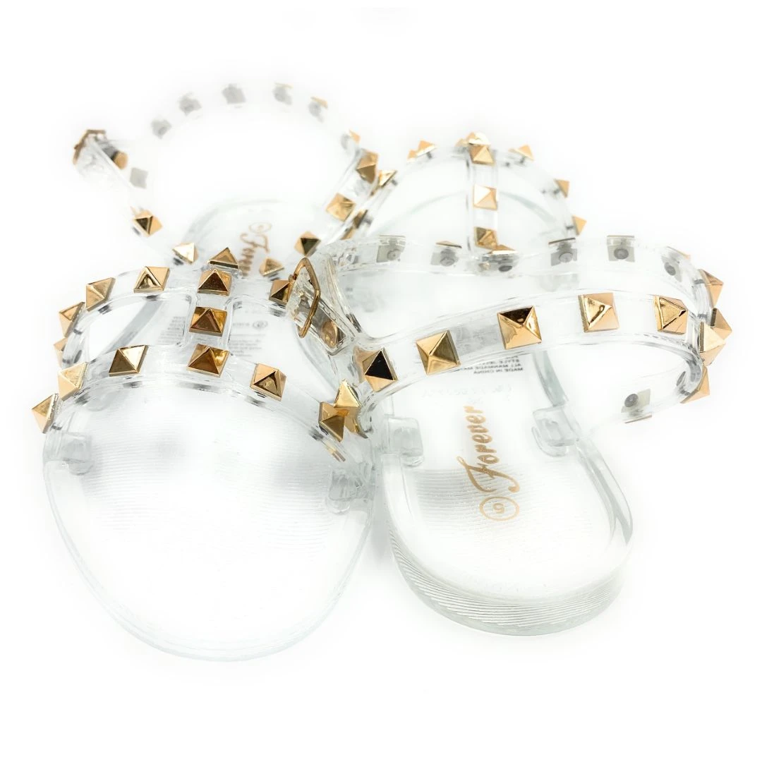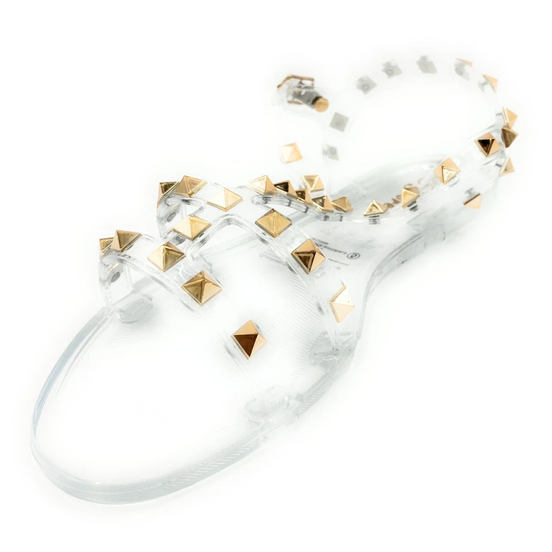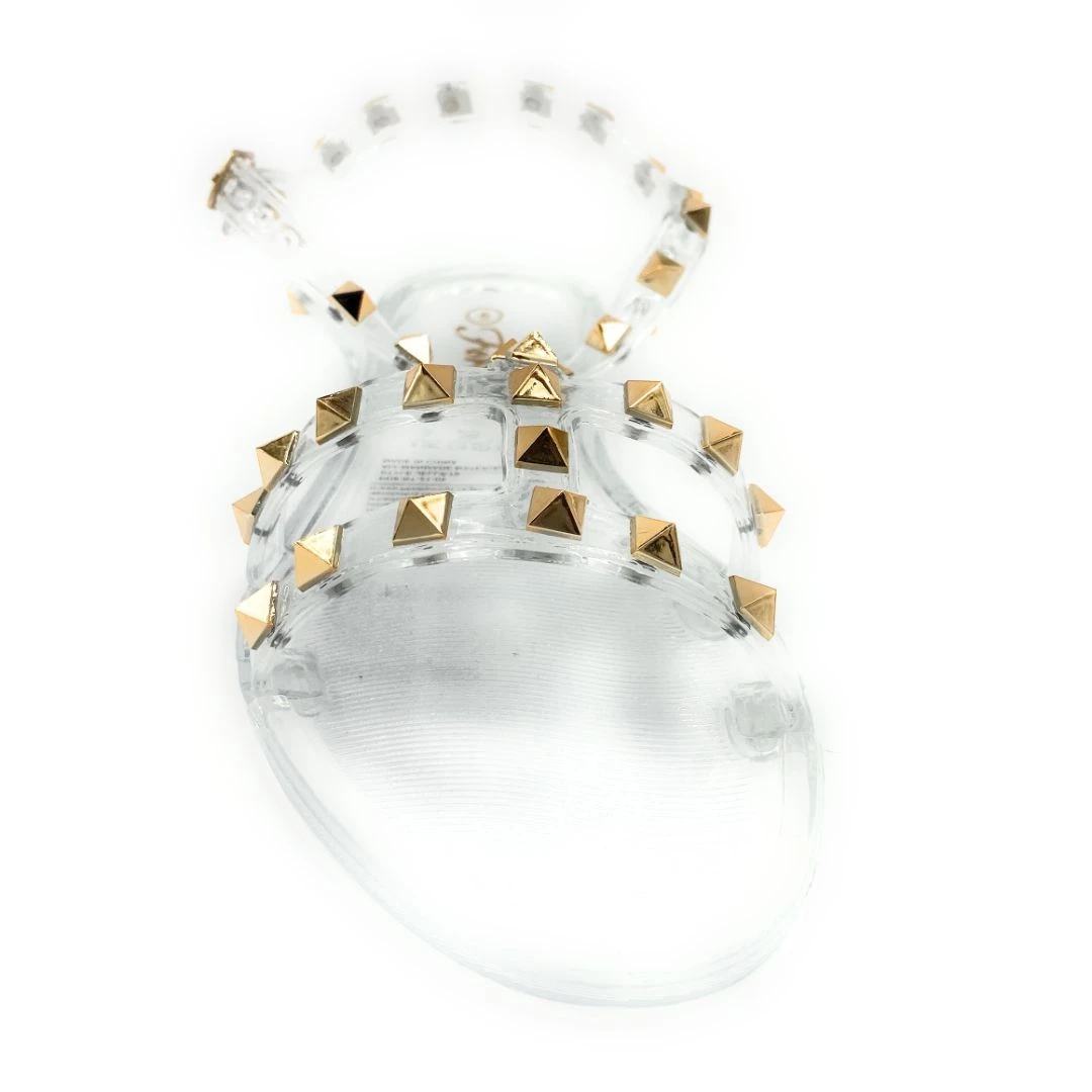 - These Adorable Flat sandal. Featuring PVC Uppers Covered in Tonal Rock studs With an Adjustable Strap Completed With a Gold tone Buckle.