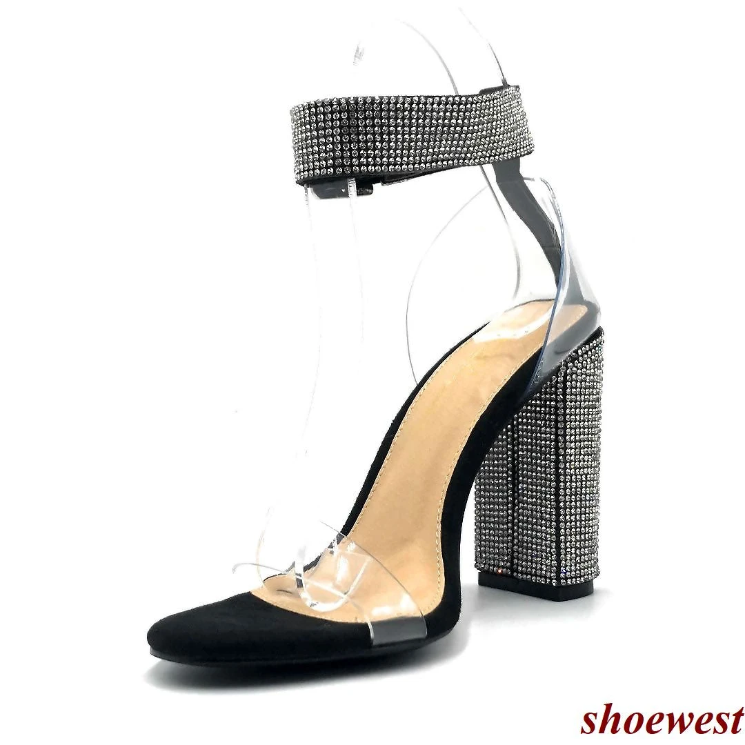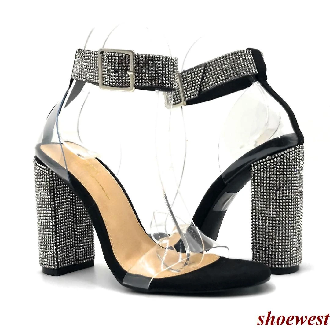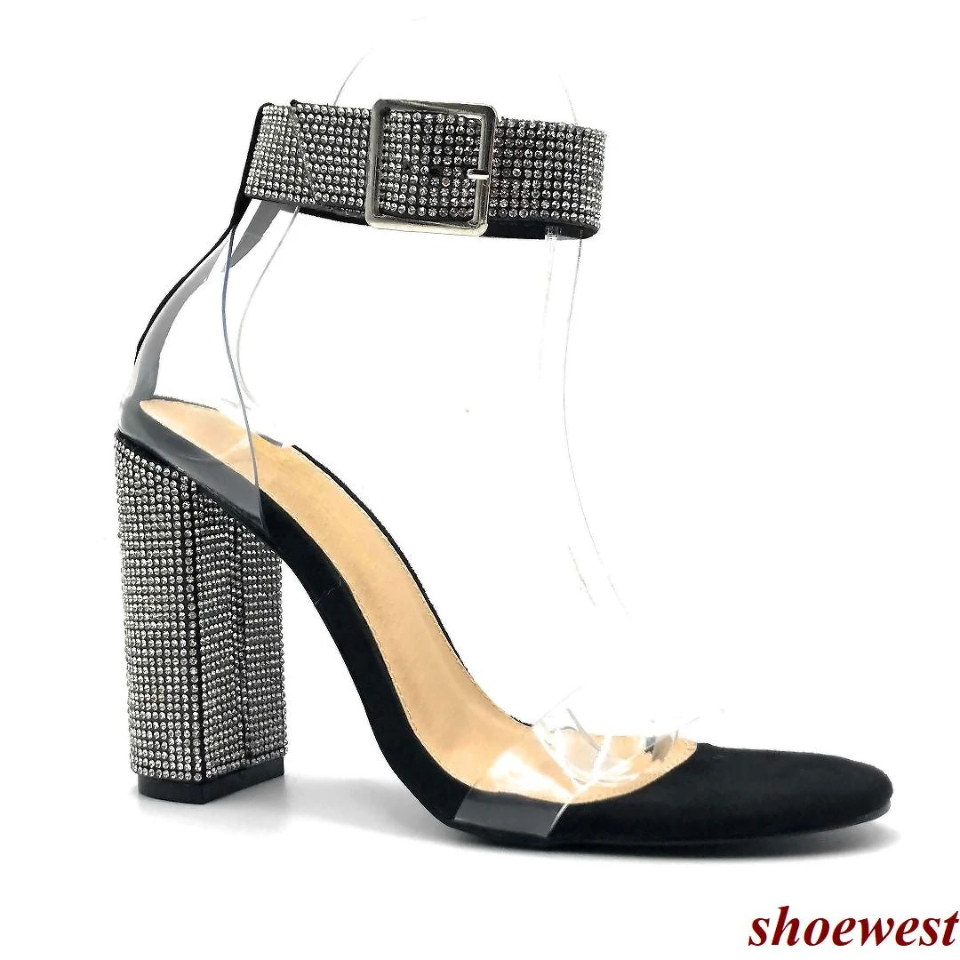 Olivia Jaymes Block Heel Sandal Rhinestone Square wide Buckle Ankle Strap Clear toe Strap