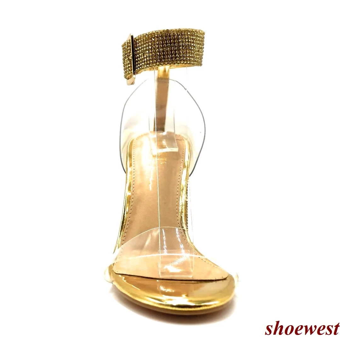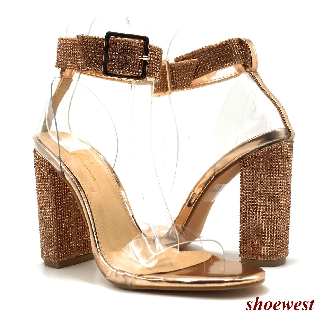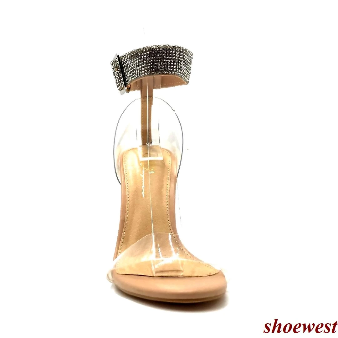 Olivia Jaymes Block Heel Sandal Rhinestone Square wide Buckle Ankle Strap Clear toe Strap