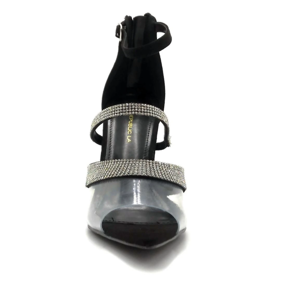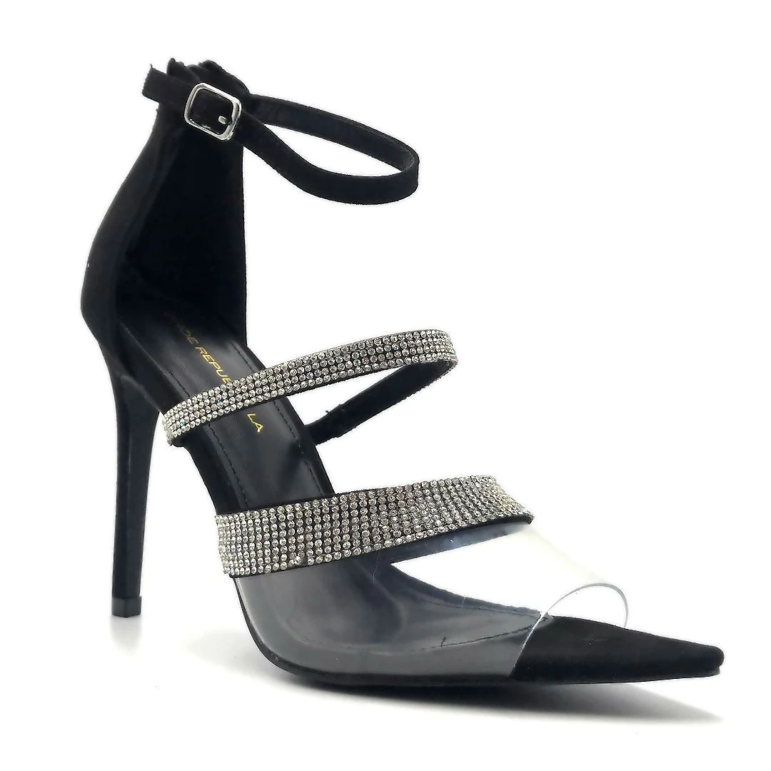 - Features a pointed peep toe paired with a covered back. A Lucite upper with rhinestone strap accents and an ankle strap closure. Single sole styling and a stiletto heel.