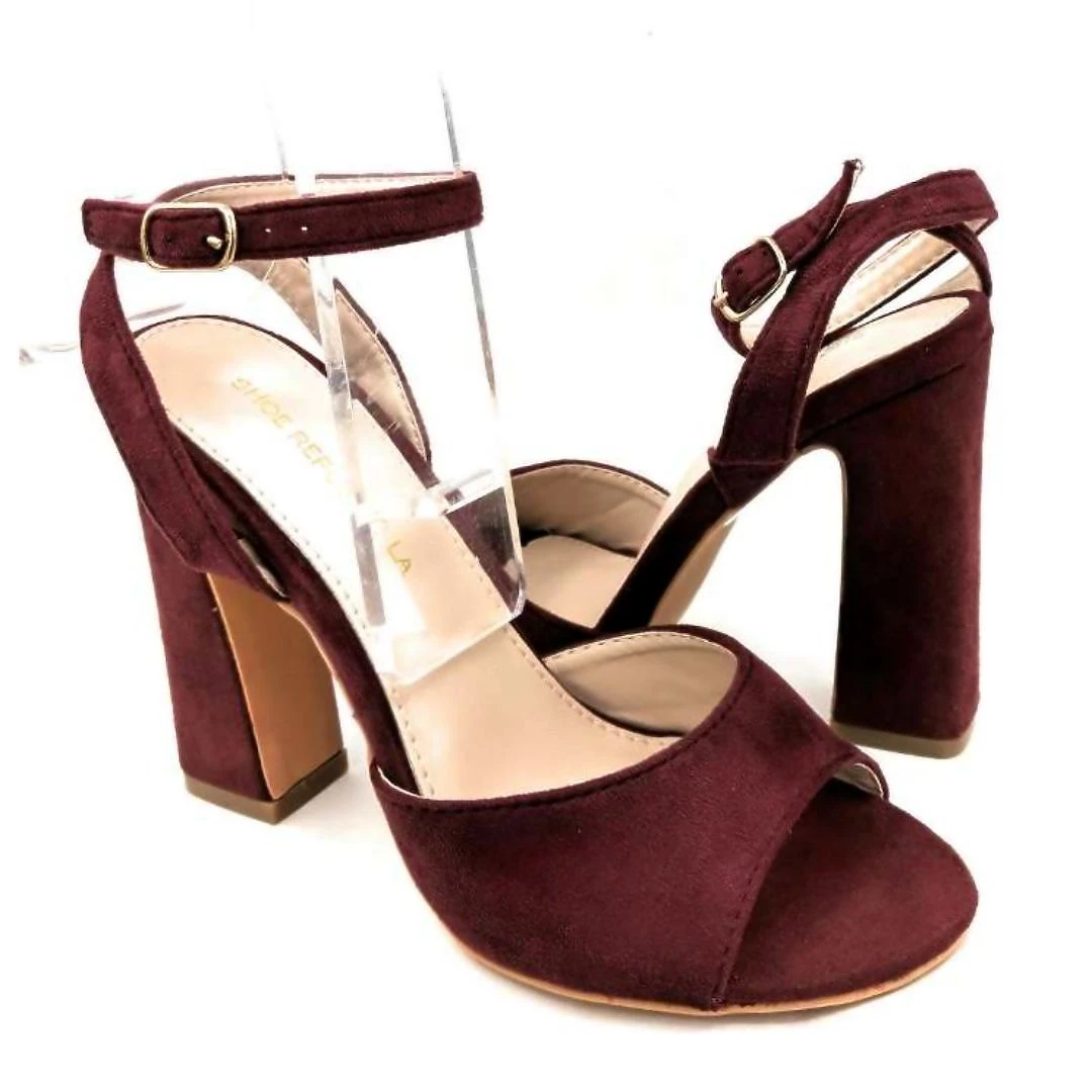 - Open toe, high heels, ankle strap, buckle closure. These simple suede heels never go out of style.