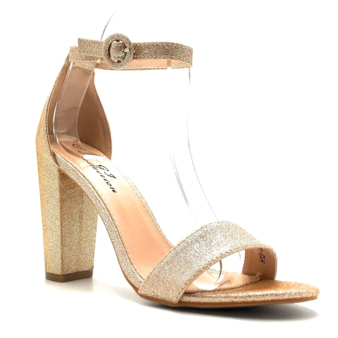 - Glittery Material Block Heels Sandals With A Round Buckle Strap To increase its Beauty And Elegancy